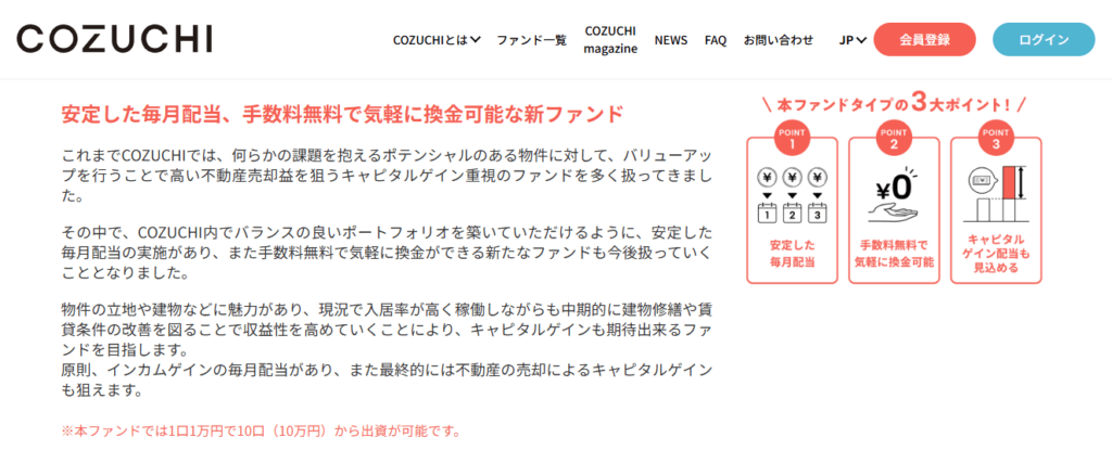 原則毎月配当、手数料無料で換金可能なファンドの募集は、COZUCHIで初めての試みだった。